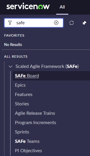Once the SAFe plugin is enabled, you’ll see a new application menu in the ServiceNow navigator labeled “Scaled Agile Framework (SAFe)”.