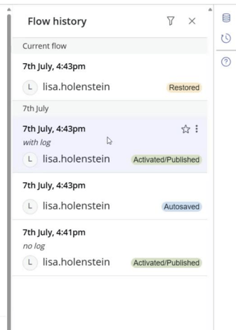 The Flow History tab allows reviewing, annotating, and restoring previous versions of a flow.