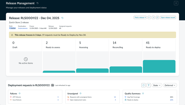 Notice the freeze date warning. The system automatically manages code freezes and ensures only deployment requests that are truly ready to make it into the release. We also get insights into the quality of the release through the deployment analyzer, which allows us to check things like instance scans and the results of ATF tests related to the deployment.