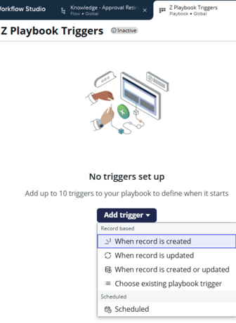 Playbooks in Workflow Studio now support multiple types of triggers—you can configure record-based triggers (reacting to specific record changes) and scheduled triggers (running on time-based intervals).
